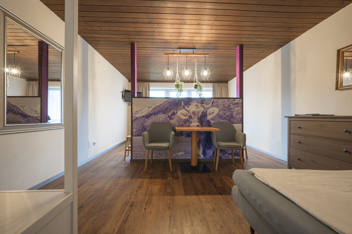 Typ 2 (ca. 18–22 m², 2–3 Pers.): Neu renoviert. Bietet zusätzlich ein modernes Bad in Naturstein-Optik, hochwertige Pflegeprodukte, Teeservice, Zimmersafe und Bademäntel.