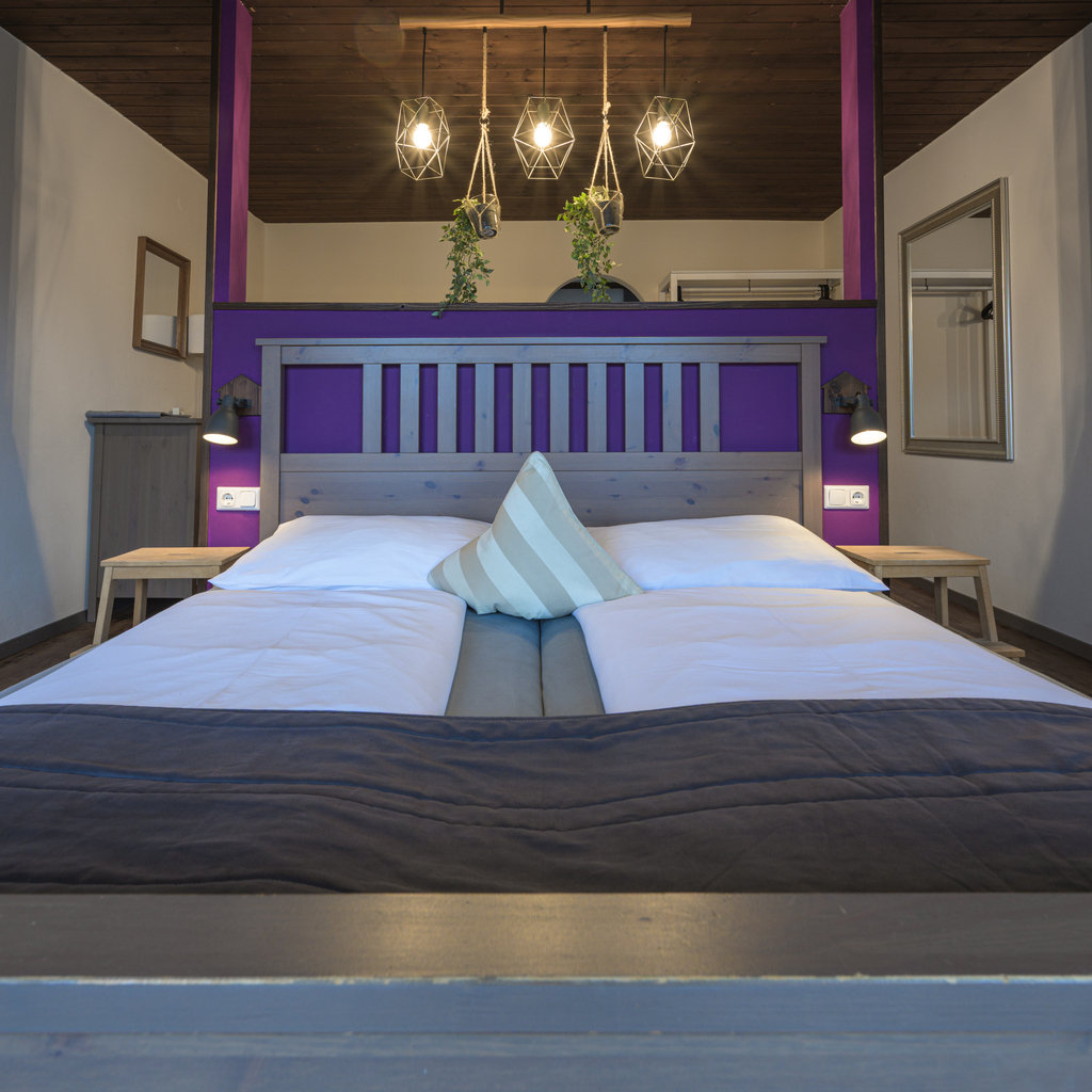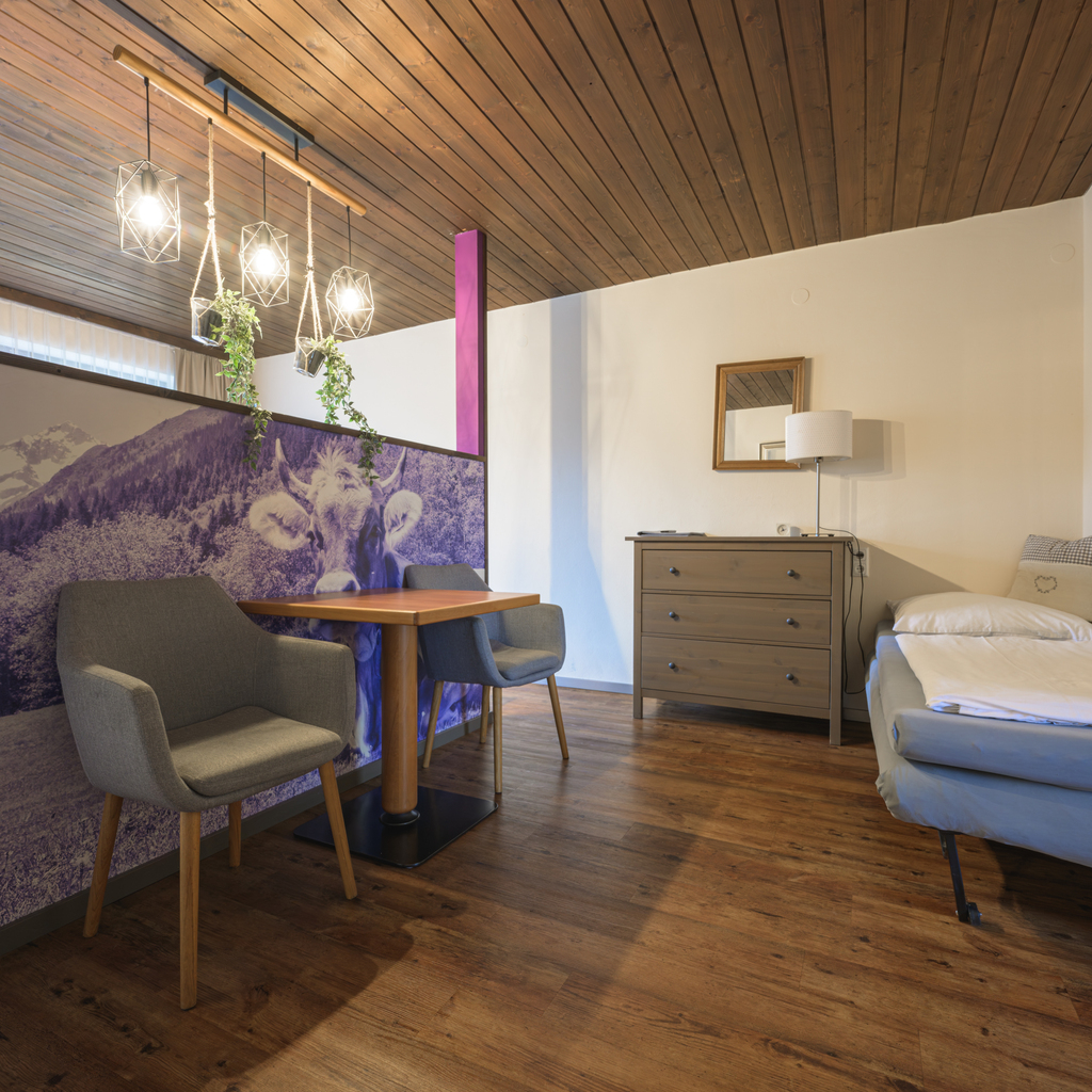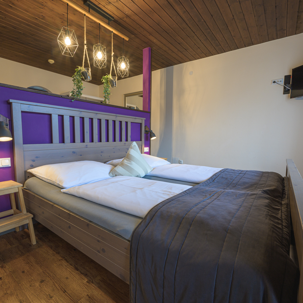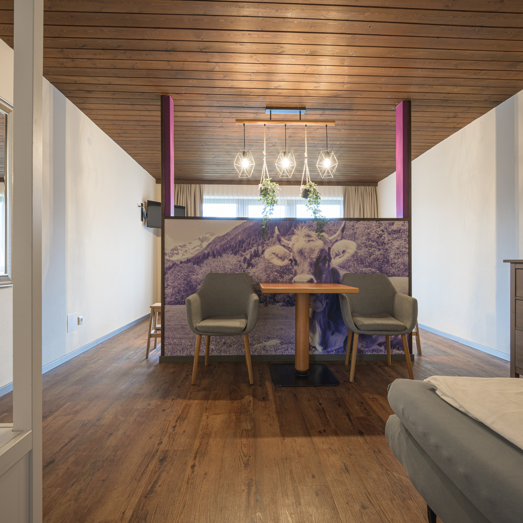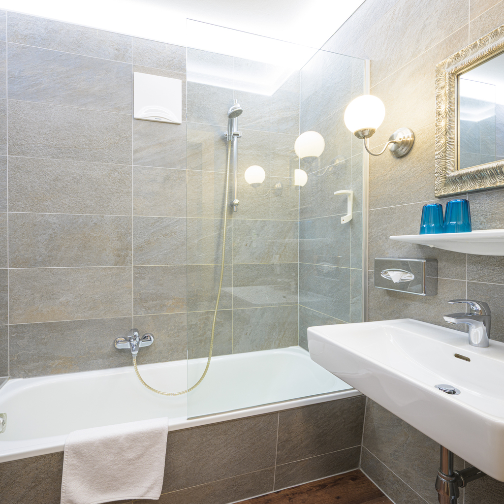 Typ 2 (ca. 18–22 m², 2–3 Pers.): Neu renoviert. Bietet zusätzlich ein modernes Bad in Naturstein-Optik, hochwertige Pflegeprodukte, Teeservice, Zimmersafe und Bademäntel.