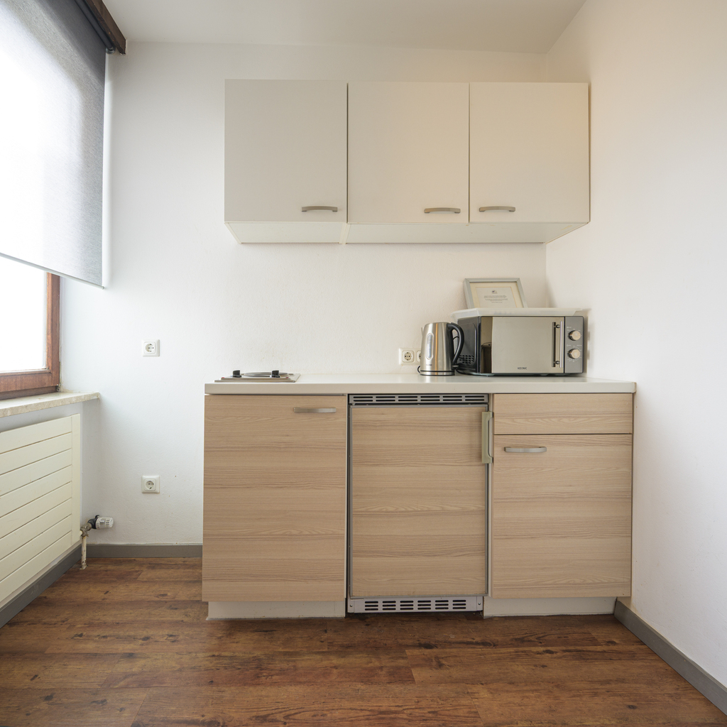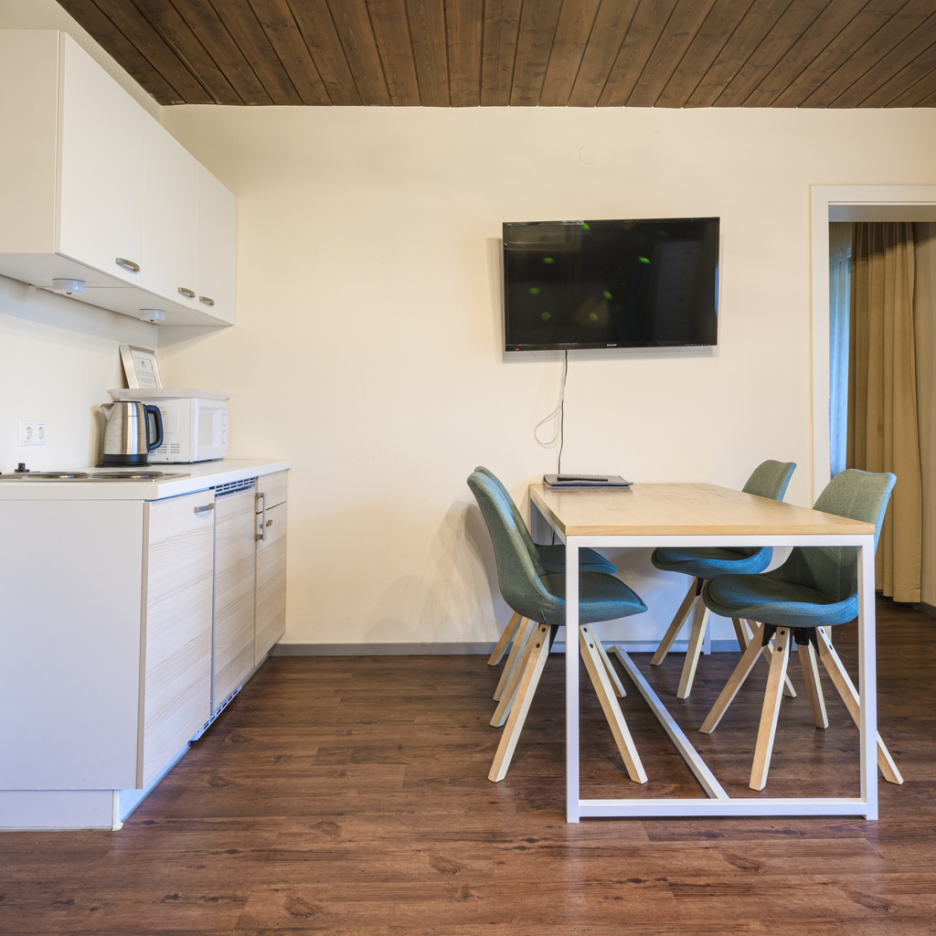 Typ 3 (27 m², 1–3 Pers.): Wie Typ 2 nur zusätzlich mit einer Kitchenette ausgestattet.